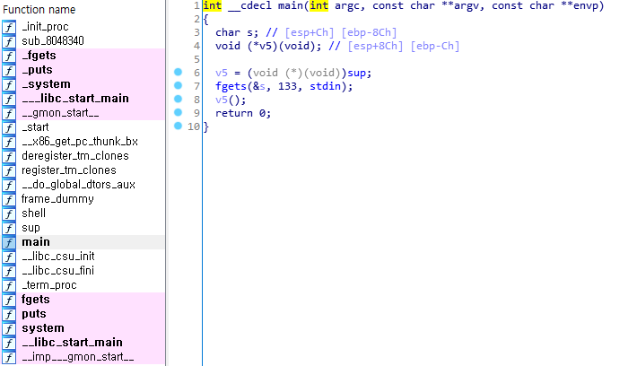 그리고 곧 이어 void형 함수 포인터 v5가 선언되어 있다.
