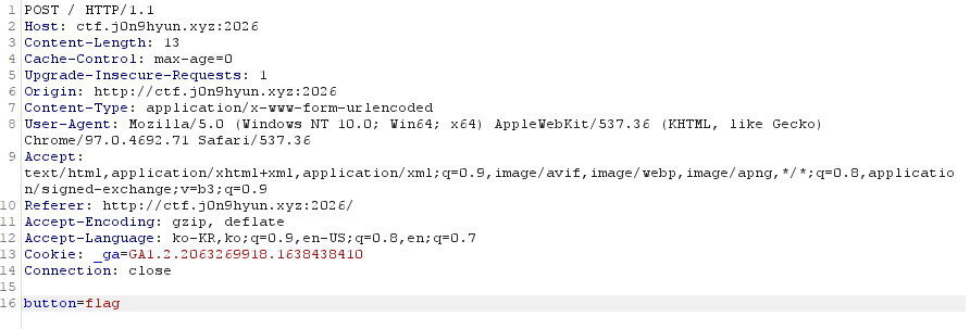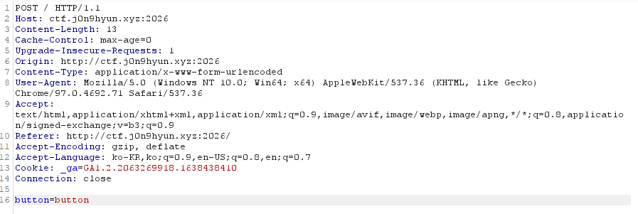 그래서 일단 무지성으로 Burp Suite를 열어서 Button 입력을 보내보았다.